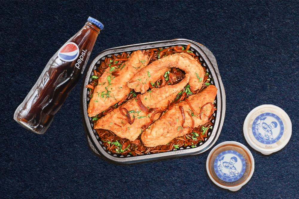 4 قطع جمبري , صيادية ، نص كيلو هامور مقلي ، شوربة ثمار البحر ، بيبسي .