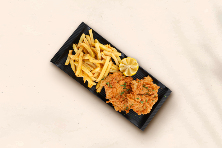 شرائح سمك فيليه مع بطاطس مقلية مقرمشة تقدم مع الصوص الخاص