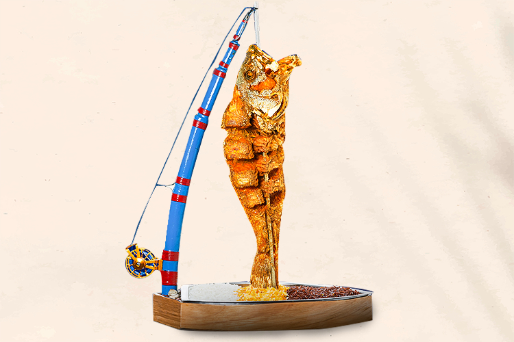 سمك شعور قمر مقلي يُقدم على سنارة صيد ثراء بالإضافة إلى أرز من إختياركم ( أبيض ، صيادية، برياني )