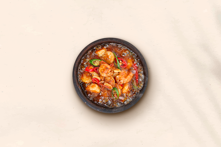 طاجن أسباني يحتوي على جمبري طازج و الثوم و زيت الزيتون و الفلفل الأخضر