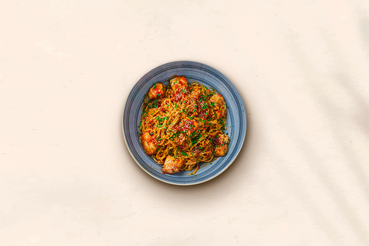 سمك بالفرن ( بحسب الاختيار ) بصوص الكوزي الأحمر مع مكرونة اسباجيتي