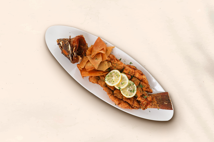 قاروص مقلي بطريقة المنقا منزوع الشوك بنسبة 90 ٪ ومتبل بالبيض و الدقيق و بهارات ثراء الخاصة