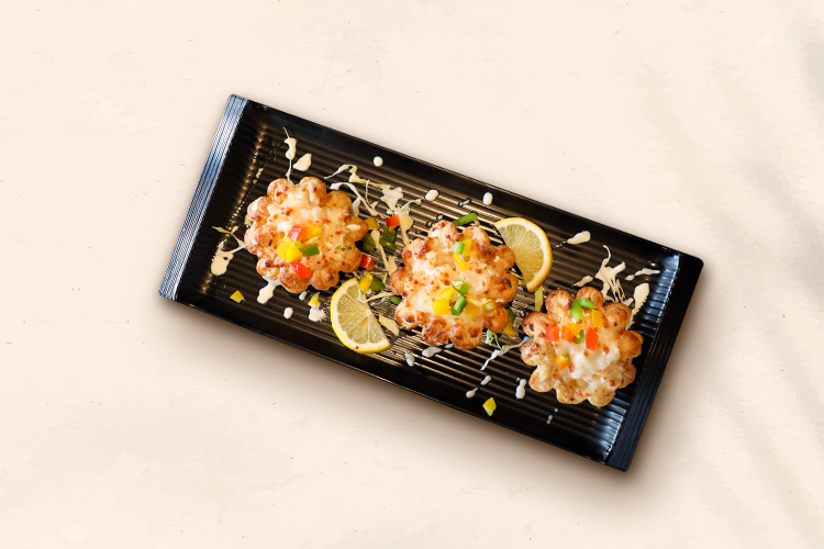 3 وردات بيف باستري محشوة بالصوص الأبيض مع قطع الجمبري المغطاه بجبنة الموزريلا والفلفل الرومي الملون